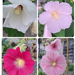 おはようございます♪ 今日のお花 芙蓉 ①白い芙蓉が涼しげです🤍 ②昨日咲いた花 ふっくらと! ③アメリカ芙蓉 大きなお花🌸 ④タカノハススキ 穂が出始めてました🩵💚 ⑤マルバツユクサ 🏷️土曜はお空の発表会 参加します♪