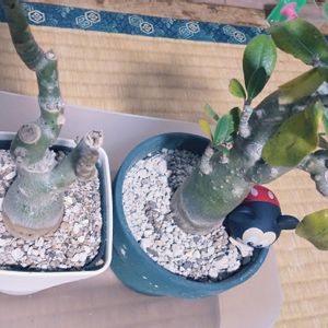 薄暗い😅 うちのアデニウム1号、2号。 1号さんは葉っぱをすべて落としてお休みしましたが、2号はふさふさしてます😳 昨日、やっと黄色い葉っぱが1枚現れたくらい。 けっこう個体差あるのかな?