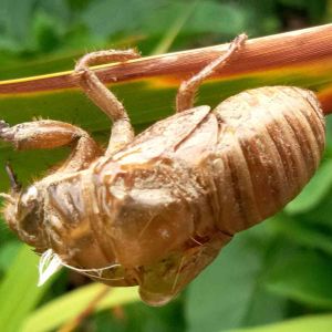 お参りしていたら抜け殻をたくさんみつけました、無事に飛び立ったんだと思います 不安定な葉っぱの先端を選んだみたいだけど神社だからなんとなく安心