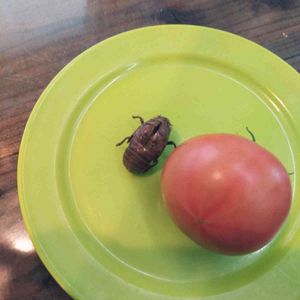 こんにちは 今日の収穫! トマトは 芋虫にやられて だいぶ減りました😢 サトイモの葉の裏に セミの抜け殻! 昨日の 元気な声は 君か!