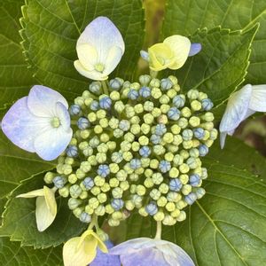 お早うございます👱♀️ pic1.2 東側のアジサイ今年はお花の数が少ない様です。 がく片が細かいピンク🩷の花は色の変化もあって好きなアジサイ5年目だったかなぁ。 pic3.4.5 ヤマアジサイ昨年お迎えした小さな可愛い苗木に花を付けました。 以前ヤマアジサイが好きでお迎えしたのですがひと夏で🌟になってしまった経験から辞めていたのだけど、手頃なお値段のこの子椿とバラの影に地植えしました。 優しい淡い緑の葉🌿と淡い花色がいいw〜。
