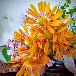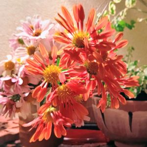 菊。 オレンジの菊をもらいました。 夜のライトで菊色が濃いくて 可愛いですよ〰🩷 寒くなってきたので こんな色の菊は あったかくて 心も和みます。 ♪〜🩷