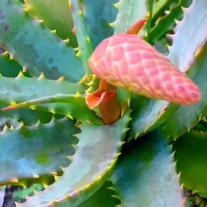 *アロエ* もしかして? アロエの花! きっとそうです。 なんだか 松ぼっくりみたいだなぁ。 と。 初めて見たので 感心しました。 もう、 そろそろ開いているのでしょうか。 真っ赤なお花だと聞いているので、 楽しみに行ってきたいのですけれど 寒いなぁ〜ー picの蕾は ピントがずれてますよね。 ザンネン。 アロエさん、申し訳ないです。 今度は ちゃんと 。 脇を締めてー 息をとめてー 撮したいと思います〜🩷 ♪〜🩷😂