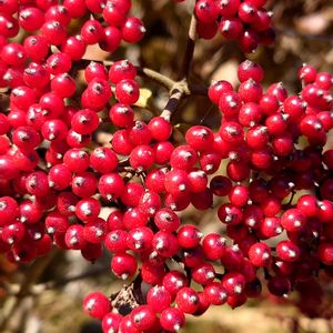 庭と近所の赤いもの 🔴 ①まだ咲いているサンパラソル ②苔の上に伸びるツタ ➂モミジを背景にしたクロガネモチ ④鳥の落とし物のコバノガマズミ ⑤こちらは多分ガマズミ 真っ赤な火曜日🏷(^_-)