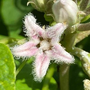 昨年の秋、赤い実を見つけたしげみ 畑の柵にいろいろなグリーンが絡みついている😅 花が咲くのを待っていました😊 ⬅️雌花 花弁が散ったあと 実がふくらみはじめている ➡️雄花 隣のつぼみは雌雄どちらだろう 形が複雑だけど、かわいいお花✨ ↖️今日🤳 あとは8月25日🤳