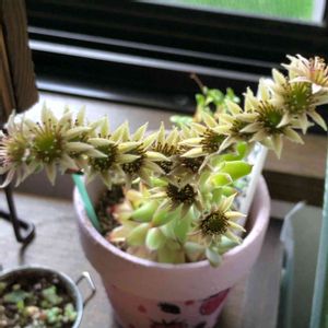 今晩は✨ 木工市でゲットした多肉ちゃん、センペルかな? 少し前にも一輪お花が咲いてアップしましたが今満開に咲いたのでアップしました🌸 この多肉ちゃん、花が咲き終わると🌟になると聞いてますがそうなのかなぁ🤔
