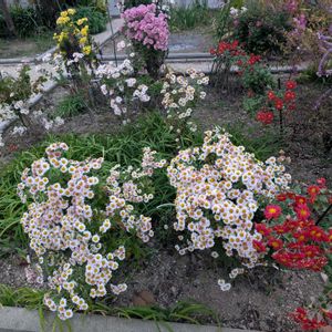 花盛りのキクで、庭が にぎわっています🎶 🧡🩷❤️💚🤍