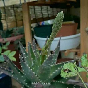 数年前にご近所さんからいただいたアロエ(名前はわかりません💦) 一度もうダメかと思いましたが、植え替えて復活! 中心部からニョキッと出てきました~花芽ですよね!?~ どんな花が咲くのでしょうか? 楽しみです♪