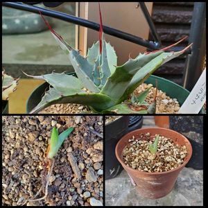 こんにちは😄 アガベさんの日、参加させてください🙋 根が出てくれなかった🦀さん! 土管理をしたけどピクリとも動かず、えぇーい💨と🌱を二枚落とし、もう一度水耕栽培をして3日☝ 根っこ出てないですか👀⁉️ ここまで来たらと、今度は土をアガベさん用ではなく、種まきや挿し木用の土に植えました😄💦 これでどーですか?🦀さん😏? って感じです🤣 パラサナさんのお子様、少し大きくなってきました😊 もうちょっと、大きくなるの見守りますね! 1コマ空いたので、 ̄(=∵=) ̄さんを! ちょっとモリモリになりすぎちゃいました😅