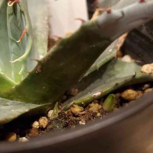 今夜2つ目の投稿です📬 アガベ・パラサナ🪴 こちらもわが家に来てひと月の実生っ子アガベさん……ですが……かなり調子悪いです😭⤵️⤵️ かろうじて成長点は緑ですが他のお色が🟫 腰水管理やめた方がいいのでしょうか🤔⁉️ わかる方いらしたら🔰の私にアドバイスお願いいたします🙇♂️