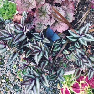 🌱トラディスカンチア🌱 以前に投稿した(21.4.25・右下) 観葉植物で作るギャザリングのその後です。 🌱🌱🌱🌱🌱 アジアンタムとプテリス・クレティカは 枯れてしまい、残念でしたが・・・ トラディスカンチアとへデラは 旺盛に育っています😊➰✴🌱✴ 今は水耕栽培から土に植え替えて育てています。