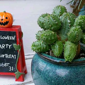 おはようございます🎵 ハロウィンの飾りつけを始めました~🎶 でも本題は右のオペサブロウです⭐ 徒長して白ペンキまでかかってる現在のお姿…😓 色はグリーンでいいんですよね~ 丸い子株、一個もぎ取って土に置いてみたいな😉 上手くいくかどうか、又失敗するかもだけど…やってみて観察したい😆