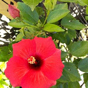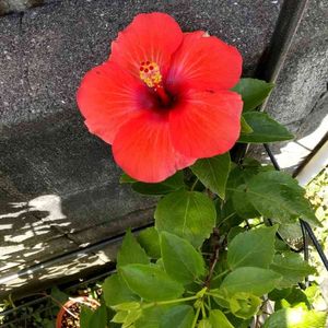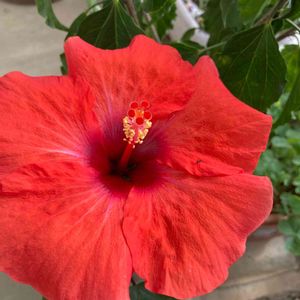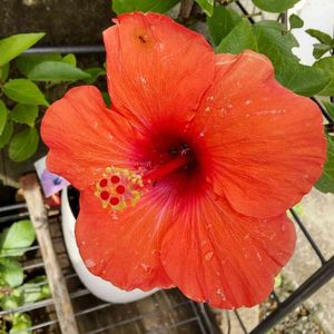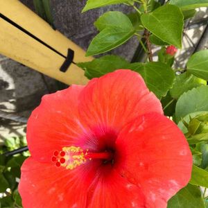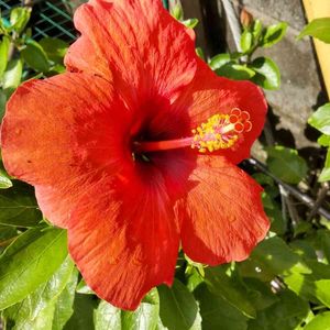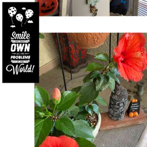 今朝のマンションの玄関 ハイビスカス 「アドニスオレンジ」❤️ 9/24以来 18日振りに咲いてくれました 😘 真っ赤な火曜日 part 2 (。>ㅅ<。)