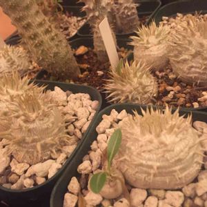 パキポディウム サキュレンタム 国内実生苗をゲットしたサキュレンタム。 先日アップしたビスピノーサム同様、南アフリカ原産で耐寒温度0℃組。 ビスピノーサムの横で、ヌクヌク窓際管理中。 ※スマホ写
