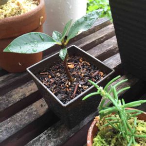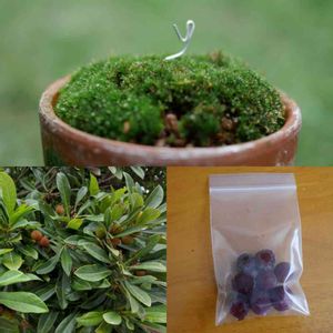 先日、東京ビッグサイトの近くに出張した際、ヤマモモが実っているのを見つけました。(左下) こんなこともあろうかと常備しているジッパー付きの小袋に、熟れて落ちている実を何個か拾って持ち帰りました。(右下) 果肉を取り除いて、種をよく水洗いした後、2.5号鉢に蒔きました。苔の育成も兼ねて、種の上には苔を張りました。(上) 何の種を蒔いたか思い出せるように、"y" の字に曲げた針金をあしらってみました。
