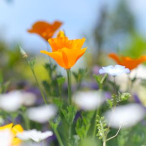 花菱草(カリフォルニアポピー)🧡 種まきっ子です♪同じく種まきっ子のネモフィラとコラボ✌️ ネモフィラは徒長気味の株が多くなってきたので、今日何株か処分しました🪴