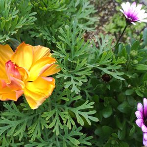 こんにちは✨😃❗ 種まきした 花菱草の寄せ植え。 ブラキカムフラスコ。 白妙菊。 花菱草が、たくさん咲いています。 花が咲き、傷んだら花びらが、散り坊主みたいになった花茎など、花がら摘みしました。 雨風には弱いので、移動させるべきでした。 長男宅にて。