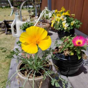 ハナビシソウ。 種から蒔いてやっと咲きました🌼 黄色だけかと思ってたら白いのも咲きました。日差しには強いのかな⁇これから日差しが強くて心配です。