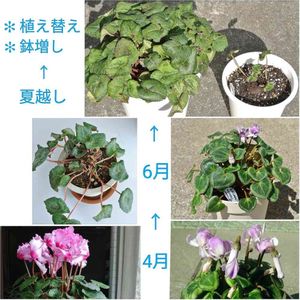 ❀ 見切りだった シクラメンの現在 植え替え後で〜す ❀ (購入後、復活の様子picは 2018年 1/28 と3/7♪) 左: シクラメン[マリッジ ピンク] 夏も新葉が 次々と入れ替わり🌿 右: ガーデンシクラメン[フェアリー ピコ] 葉を虫に食べられ 心配よ😅 💖 植え替え方法は↓同じです↓ (^^) 💖 下のタグ「あおぞら編 まとめ②」ダイレクトに ご覧にもなれま〜す🎶