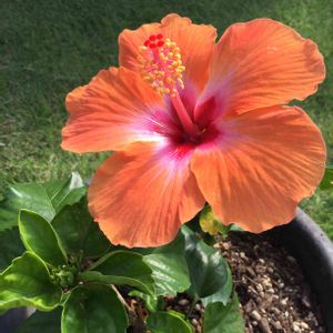 おはようございます☀ 今日も暑くなりそうです! 先日ホームセンターで見切り品になっていた200円のハイビスカスが綺麗に咲きました🌺 オレンジ色なのもお気に入り♪