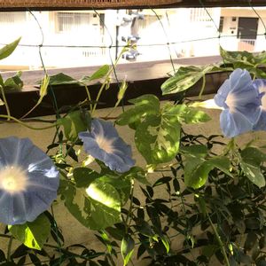 アサガオ💙🌿 鉢植えからベランダの壁沿いに 2mは伸びてます🌿 壁沿い一面に咲かせたかったから 今朝は喜びもひとしお🥰 と、思ったら… 朝6時は元気に開いていたのに 10時には暑くて、しおしおになってる💦 今日2回目のお水をあげようとしたら セミがぁ〜❗️生きてる?死んでる? あなた急に動くから怖いのよ〜😱