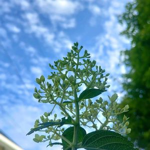 ピラミッド アジサイ ライムライト まだ蕾ですが空に向かって伸びてきました 今年は鉢を一回り大きくしたから少し元気になったみたい 葉っぱが虫に喰われてますが…