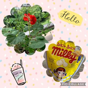 今日は2投稿目お願いしまーす 切り戻していたゼラニウムさんにまたお花が1輪咲き出しました❤️ ユーフォルビアもまた小さい蕾つけて 茎が伸びて来ましたよー また競演が楽しみです〜✳︎✳︎✳︎ GS友さんからペコちゃんのミルキー頂いたので、久しぶりに🏷ぺこちゃん祭りに参加させて下さいね〜 🎵❤️ミルキーはママの味❤️🎶