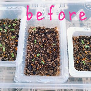 台風前の我が家の実生苗 (こぼれ種も有)達 1枚目 こぼれ種からセルトレイにあげた苗達 ポット上げしようしようと思いつつ そのままになっています😥 2枚目は実生苗 (下の段2つは忘れな草とゴテチャも有り) こう見るとこぼれ種より ちっさいですね 3枚目は時々葉が茶色くなりながら (私の管理が悪いんですね) 巨大化していく バーバスカムサザンチャーム 9/20頃ポット上げして 約2週間ちょっとでこんなデカく😱 これ地植えしたらどうなるんだろう 台風時どこにおこうか悩む 私です