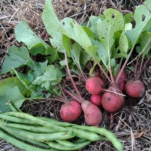 畑の様子🌱 ラディッシュが可愛い❤ 三尺ささげはきんぴらにいれました😋 ローゼルはすっかり萎えてしまったのに同じアオイ科のコットンはまだ花が咲いています🤔