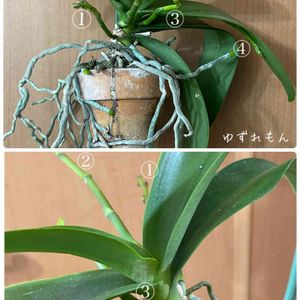 狂い咲きして枯れる気かも🙄 花終わりに下葉が枯れて貧相なお姿の胡蝶蘭 花芽上がって来た🙌と喜んだものの…こんなに⁉︎ ③と④は同じ場所から出て来てる😑