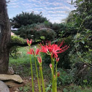 おはようございます🙋 今日のお花 ヒガンバナ 今朝実家の裏庭で撮りました 秋空高く雲が近くに感じられます 昨日はお彼岸で親戚で集いました 花を見立てて、沢山のお料理と持ち寄って頂いたもので愉しく賑やかに笑いの絶えない一日でした ありがとうございます💕💐💕お母さん、私は元気ですよ〜🎵 良い一日になりますように💕🙏💮💪👋 歌詞の掲載はNG⚠️でした 申し訳ないです🙏