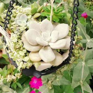 木にぶら下げた多肉さんの下から背の高いフランネルソウがニョキニョキ迫ってます🤩