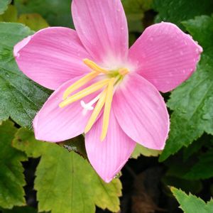 《サフランモドキの花🌸》 桃色の花弁、「おしべ」の黄色の葯、真っ白な「めしべ」が鮮やかです。 上向きに咲くことが多いのですが、この花は少しうつむきに咲いています🌸 サフランモドキは、中央アメリカ原産のヒガンバナ科タマスダレ属の多年草