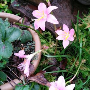 🩷サフランモドキ 明治時代の人はずっとサフランの花だと思っていたそうです。本当はゼフィランサス・カリナタという名前があるそうです。 ⚫︎ヒガンバナ科 タマスダレ属 ⚫︎原産 中央アメリカ ⚫︎花期 6月〜7月