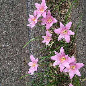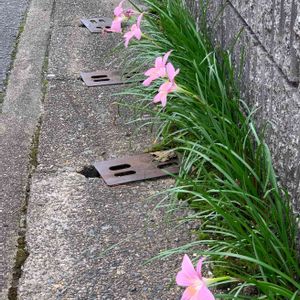 おはようございます😃 道路の隅、ほとんど土の見えないブロック塀の下に、サフランモドキでしょうか。 可愛らしいピンクの花を咲かせています。 雑草も育ちにくい、過酷な場所で、凄い生命力です。👍 同じ仲間の、白いタマスダレの花を田んぼの畔などで見かけます。 真っ直ぐ立ち上がるタマスダレに比べると、斜めに傾いだ花が優しく感じられます。😘