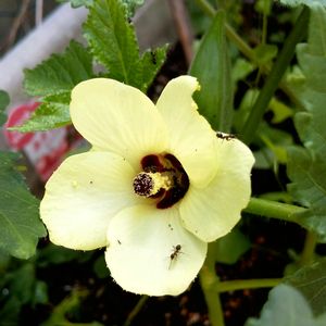 蕾のうちしないから 🐜🐜🐜が ピラミッドによじ登り あぶら虫でも集っているの!? とヤキモキしたが 今朝、無事に花開いてくれた😃 👧 黄色い花だよ 優しそうな花びらだよ いちにち花なんだね オクラの花は