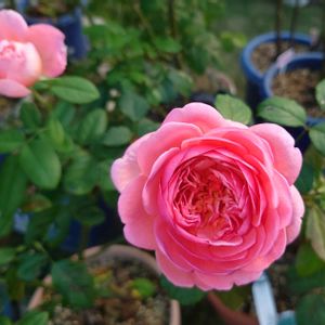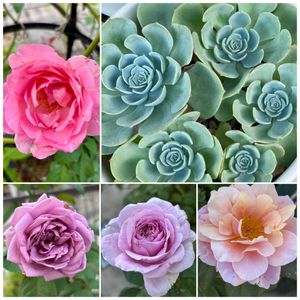 みんな集まれ、私のそばに 台風シフトしました 多肉の周りにバラなどの鉢を寄せます 右上から右回りに ・七福神 ・ディスタントドラムス ・海(かい) ・カインダーブルー ・リアンローズ