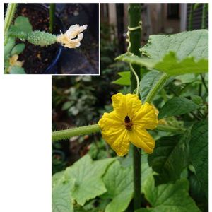 西洋胡瓜・再度投稿です。 🟡黄色🟡の花がとても可愛く咲きます。その数知れず、樹勢の強さに驚きます。花の中心は蕊❗ではなく、🐝蜜蜂ハッチ🐝くんです。 この胡瓜、糠漬けでもピクルスでも、とても美味しく頂けます😁❣️。