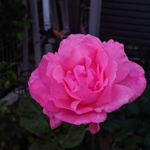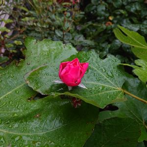 おっと、イチジクの葉っぱに花が咲きました❗😁。イチジクの株のそばの薔薇鉢植えから枝が伸びて・・・こんなことに‼️。 薔薇だけど「紅一点」かな❣️。