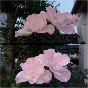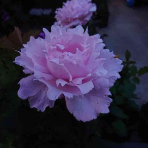 こんばんは🎵。夕暮れの「ソフィー・ロシャス」さん❣️満開です❗。フリフリ、フリフリです。