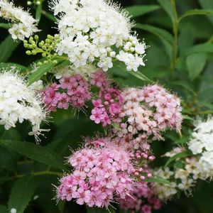 一本の木から 最初は白だけ その後 白 ピンク 薄ピンク と三色咲く様になった シモツケです。