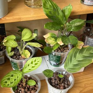 最近入手したマランタ・レモンライムです。 前から欲しかったのだが、ホームセンターで見かけても大株しか無く、お値段も1.5万ぐらいするので手が出しづらい。 ただ、メルカリなら2500円で↓写真のサイズを購入出来る。 丁度いい価格とサイズを提供して頂いた出品者さんに敬礼🫡