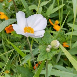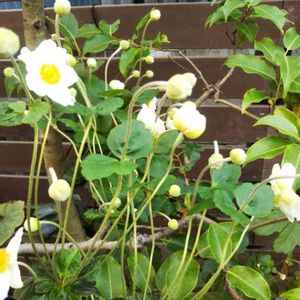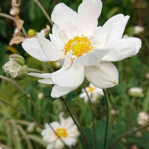 シュウメイギク オノリーヌ・ジョベール 白の一重、約百年前にフランスで生まれた品種に、ジョベール氏は娘さんの名前をつけたのだとか。 こうしてつぼみや横顔を見ると、確かにアネモネの仲間ですね(*^^*)