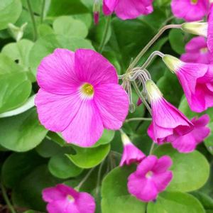 今日のお花🌸オキザリス 1️⃣2️⃣ハナカタバミ(花酢漿草) 別名 オキザリス ボーウィー 花の直径 3〜5cmと大きい 3️⃣4️⃣イモカタバミ(芋酢漿草) 花の中は紫色で雄蕊の葯は黄色 花の大きさ直径1.2〜1.5cm 3️⃣オキザリス.トライアングラリス 花はムラサキカタパミに似ていて、それより薄いピンク色で直径2〜4cm 小葉は3〜5cmの倒三角形が3枚で、色は紫色か薄緑色 別名「紫の舞」と呼ばれる 葉は日当たると開き、夜は閉じます 斑入りのものもあり蝶の羽の様です カタバミとは種で育つ小さな花ですが、オキザリスは球根で育つ比較的大きな花を指します