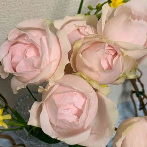 コロンとした愛らしいフォルム、優しい色合い、爽やかな甘い香り🌹 やや大型のスプレーバラ「春がすみ」という品種だそうです💕 仕事帰りに立ち寄った、花屋さんで一目惚れ😍