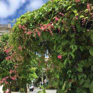 プールへ行く途中! ずっと気になっていたこの花!ブーゲンビリア?サルスベリ?何?と思っていましたらー!今日、この苗が市場で売っていました❤アサヒカズラと言うそうです!今、まさに満開です! ちなみに昨日アラマンダをアップしたお宅!今まさに花御殿です💗💗💗💗💗
