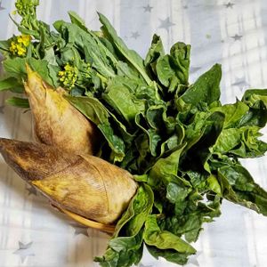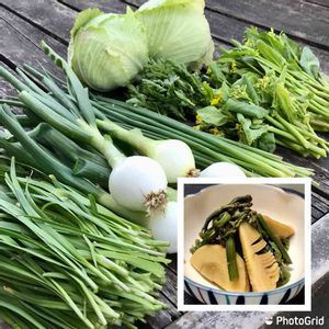 週末日曜☀️朝の畑の恵みは、葉物野菜いっぱい😊。 昨日採りの筍とワラビは、朝食の煮物に🤤。 さて、今日も野良仕事三昧💪。