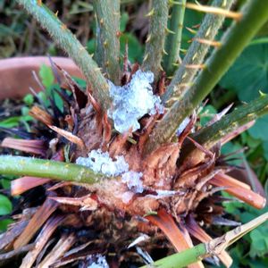 今朝、ほんのちょっとだけ積もった雪。 蘇鉄の間にね。 蘇鉄の刺、痛いんですよね😭💦💦