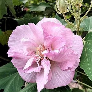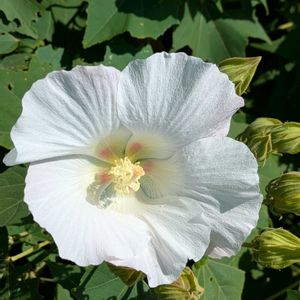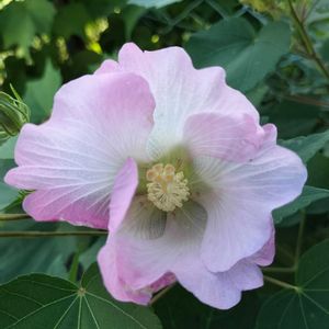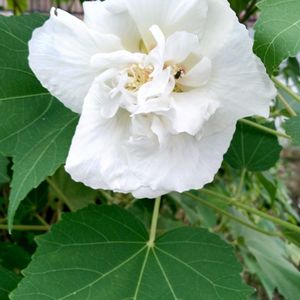 「スイフヨウ」(酔芙蓉) 午前中は白色ですが日が暮れるに従って赤くなります。赤くなった花は翌朝には元気なく萎んでまるで酔っぱらいです。(撮っていなかった😅)