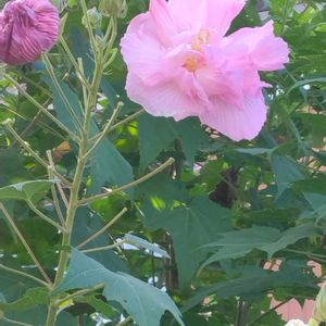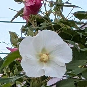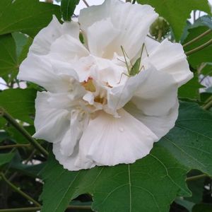 散歩で出会いました。 真っ白な薬玉酔芙蓉。 一重と半八重の木槿。